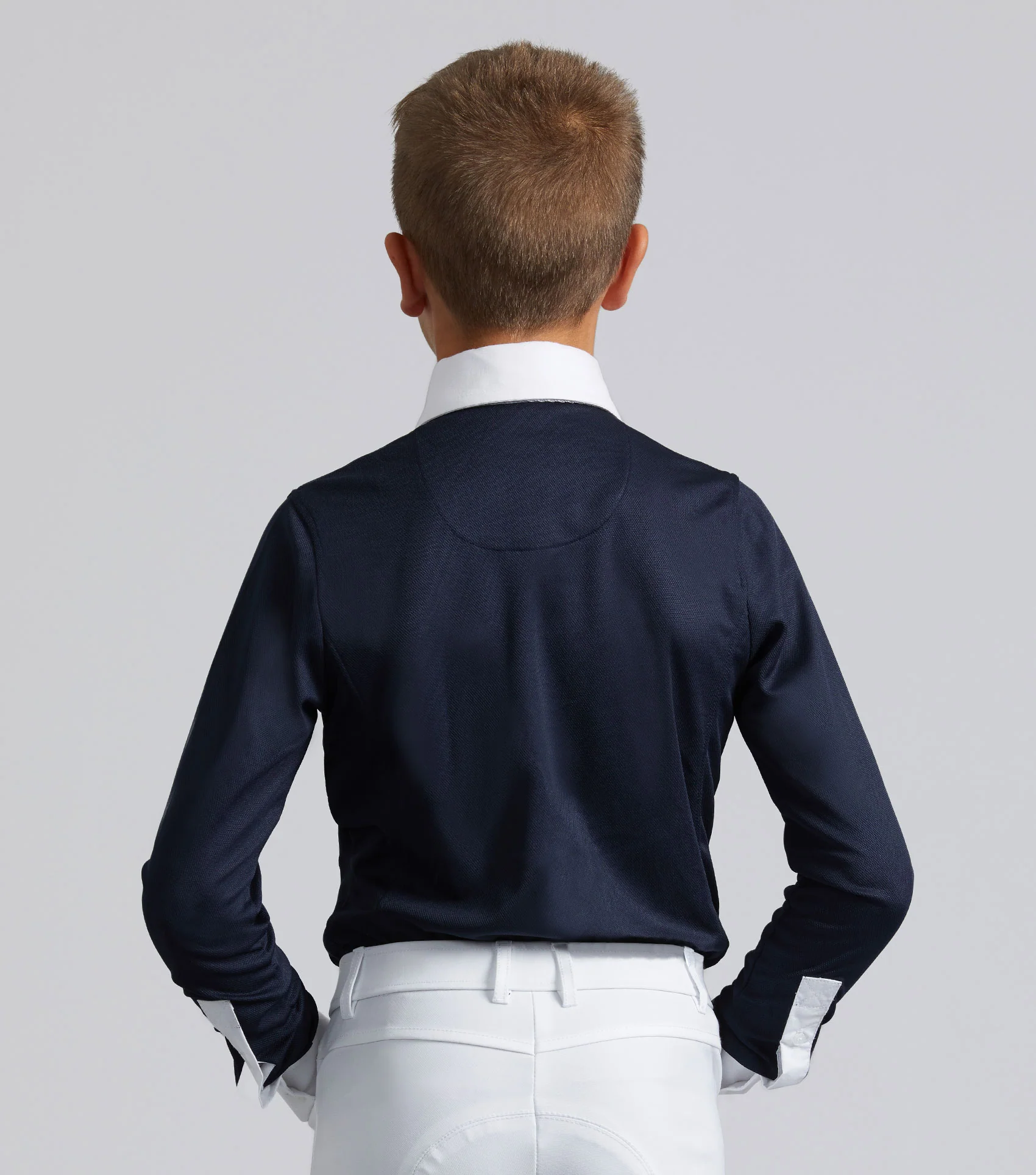 A sophisticated boy's competition show shirt engineered with technical four-way stretch pique jersey which boasts high breathability and moisture wicking properties, ideal for keeping cool and comfortable in the show ring.