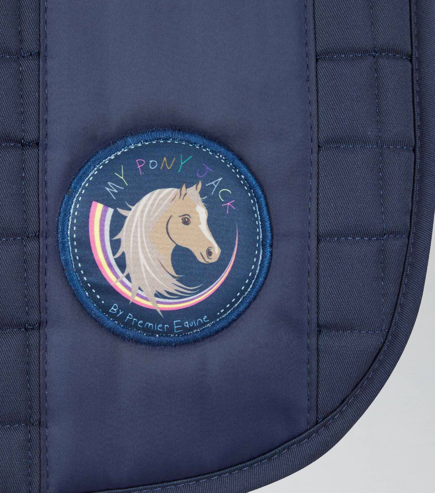 Adjustable Velcro straps allow for secure girthing and an elongated, shaped 600-denier polyester girth panel has been incorporated for anti-rub protection and adds detail with “Walk, Trot, Canter” embroidery. Finished with our signature “My Pony Jack” padded badge.
