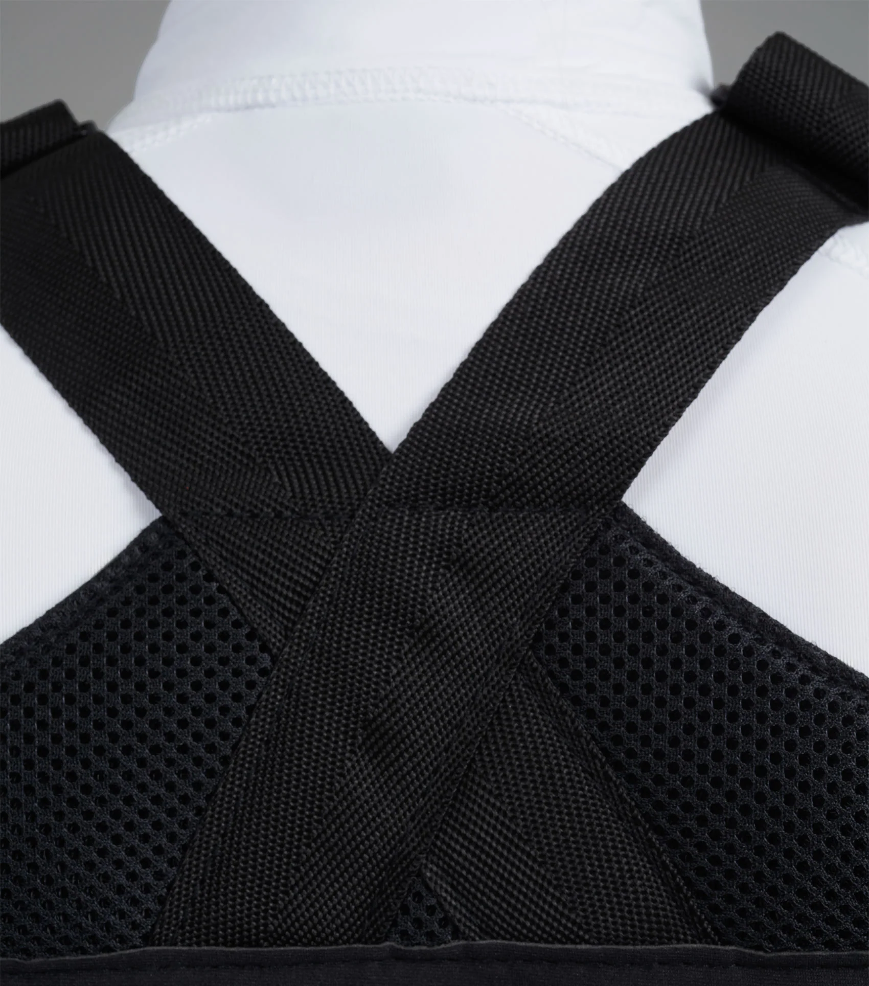 Adjustable straps over the shoulder allows for a custom fit, with fitting options to fit over your body protector and the elastic waistband fastens with a plastic clasp for a comfortable, secure fit.